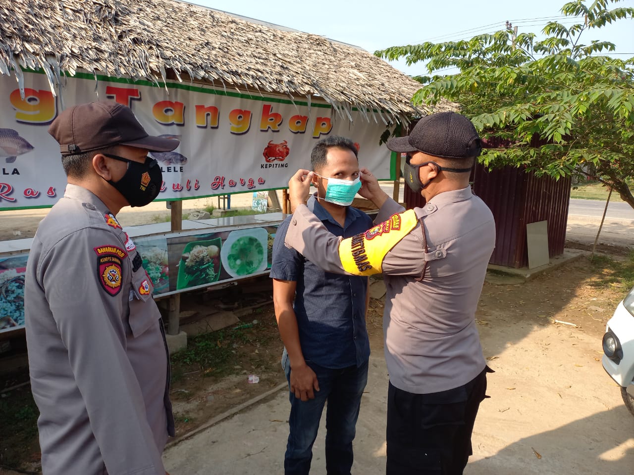 khabarterkini.id | Pelalawan – Guna memutus mata rantai penyebaran Virus Covid-19, Polsek Pangkalan Lesung Polres Pelalawan berikan himbauan dan bagikan masker gratis kepada masyarakat, Minggu (6/2/2022).