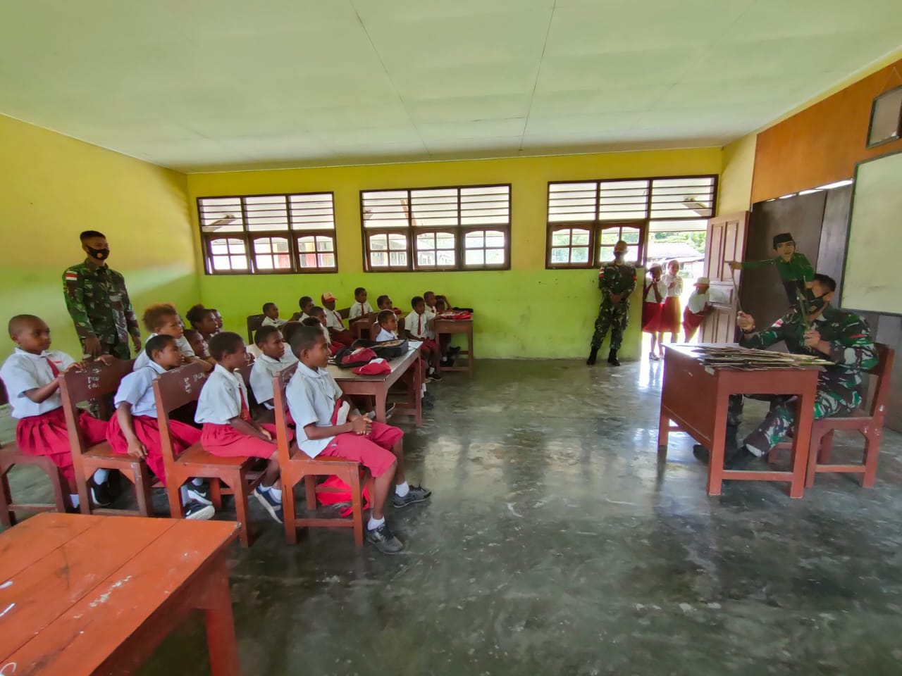 Keerom|khabarterkini.id“Anggota Satgas Pamtas RI-PNG Yonif 711/Rks melaksanakan mengajar anak melalui metode wayang dari kardus dan mengajar materi PBB di SDN Inpres Ampas,Kampung Ampas Kecamatan Waris, Kabupaten Keerom, Jayapura Rabu (09/02/2022).
