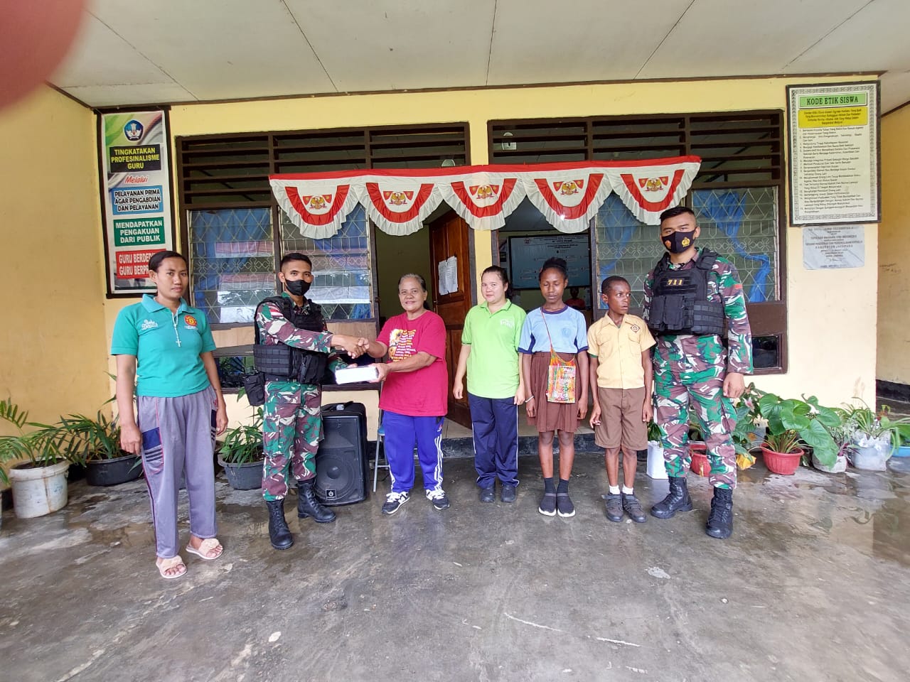 Keerom | khabarterkini.id“Untuk Menumbuhkan kedisplinan bagi generasi muda di perbatasan, Personel Pos Wembi Satgas Pamtas RI-PNG Yonif 711/Rks, Memberikan bantuan buku tulis dan mengajarkan baris berbaris di SD YPK Desa Mannem, Arso Timur Kabupaten Keerom, Jayapura.