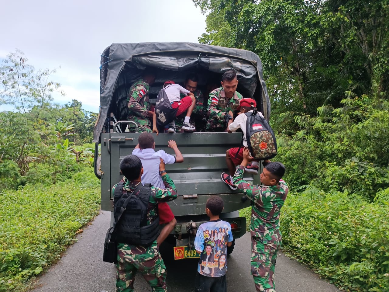 “Melihat kondisi tersebut, Satgas Yonif 126/KC, Pos Yuruf tergerak untuk mencari solusi mengatasi kesulitan anak-anak sekolah di sini. Kami manfaatkan kendaraan dinas kami untuk mengantar dan menjemput anak-anak sekolah disaat tidak kami gunakan untuk operasional Satgas,” ucap Dansatgas.