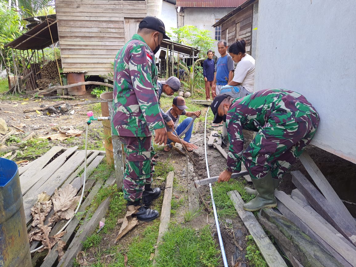 Serka Jumali beserta dua rekannya”, kami membantu warga dalam pemasangan Saluran pipa air bersih ini dari penampungan air desa sampai ke lingkungan sekolah”, harapannya air ini bisa mengalir trus sehingga bisa digunakan warga dan anak sekolah”, imbuhnya.