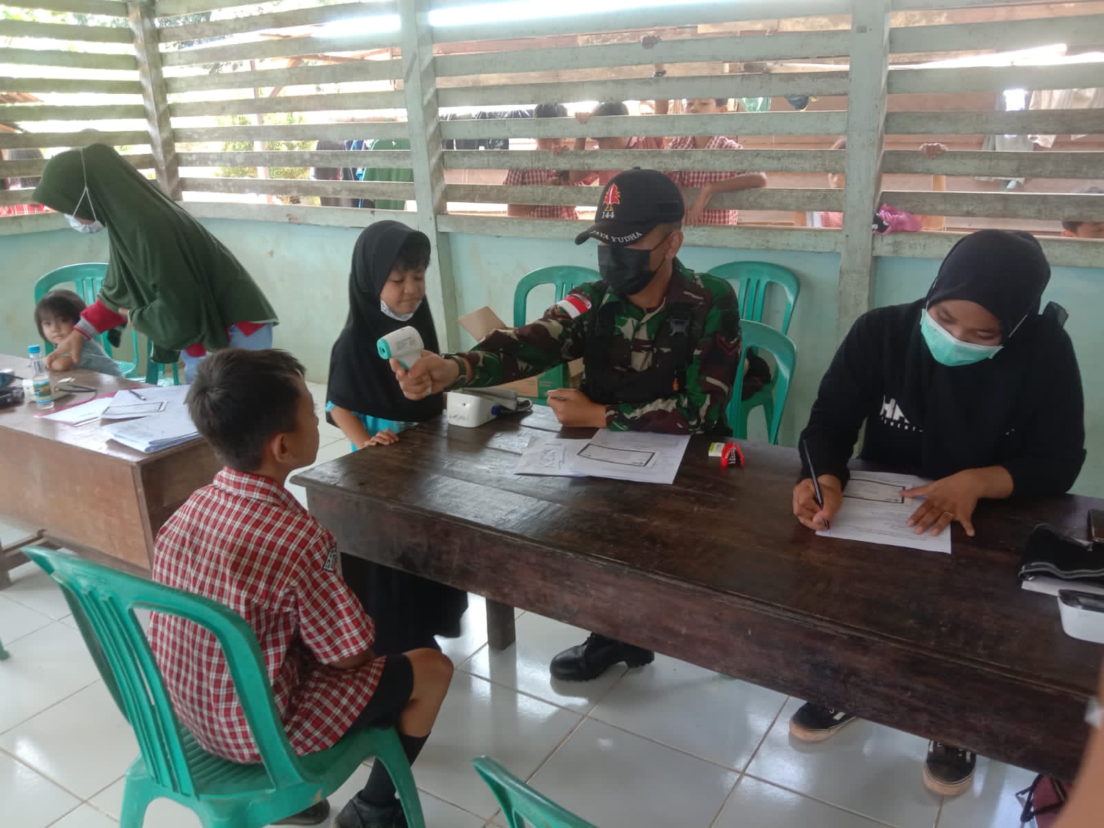 Muakan Petinggi | khabarterkini.id Anggota Satgas Pamtas RI-Malaysia Yonif 144/JY gelar Vaksinasi Anak SDN 08 bersama Nakes Puskesmas di desa Muakan Petinggi Kecamatan Ketungau Hulu Kabupaten Sintang Kalbar.