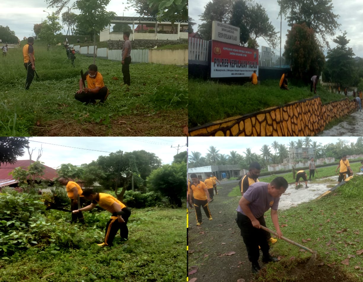 Untuk lingkungan Mapolres dipimpin langsung Kapolres Kepulauan Talaud AKBP Dasveri Abdi,SIK didampingi Wakapolres Kompol Demetrius Lariwu, diikuti juga oleh PJU Polres, Bintara dan PNS dengan alat sederhana, Kapolres bersama anggota membersihkan dan memotong rumput dengan mesin paras serta mencabut rumput liar dan memungut sampah daun dilingkungan depan dan belakang Mapolres.