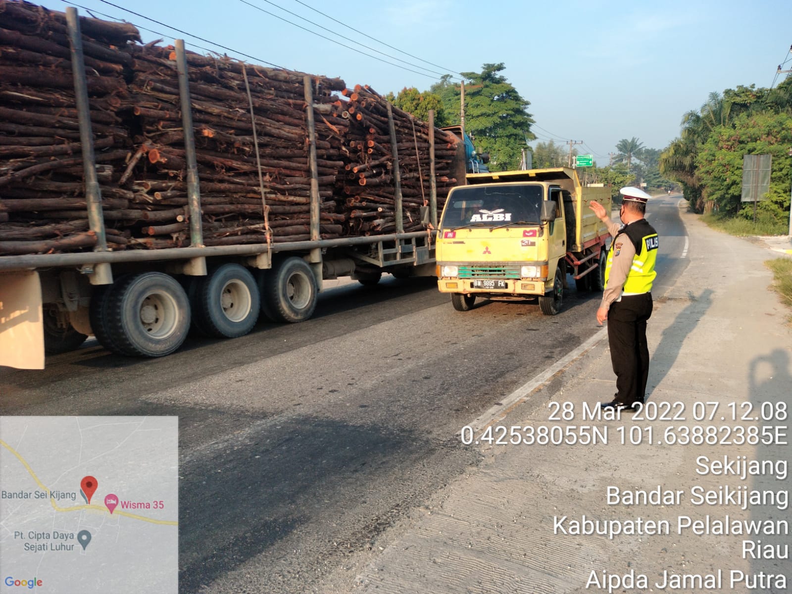 Pelalawan|khabarterkini.id-Aparat kepolisian dari Polsek Bandar Sei Kijang melakukan pengaturan lalu lintas di Jalan Lintas Timur, KM 34 Kecamatan Bandar Sei Kijang, Kabupaten Pelalawan, Senin (28/3/2022). Kegiatan tersebut terus dilakukan oleh Aipda Jerry S. dan Aipda Jamal.