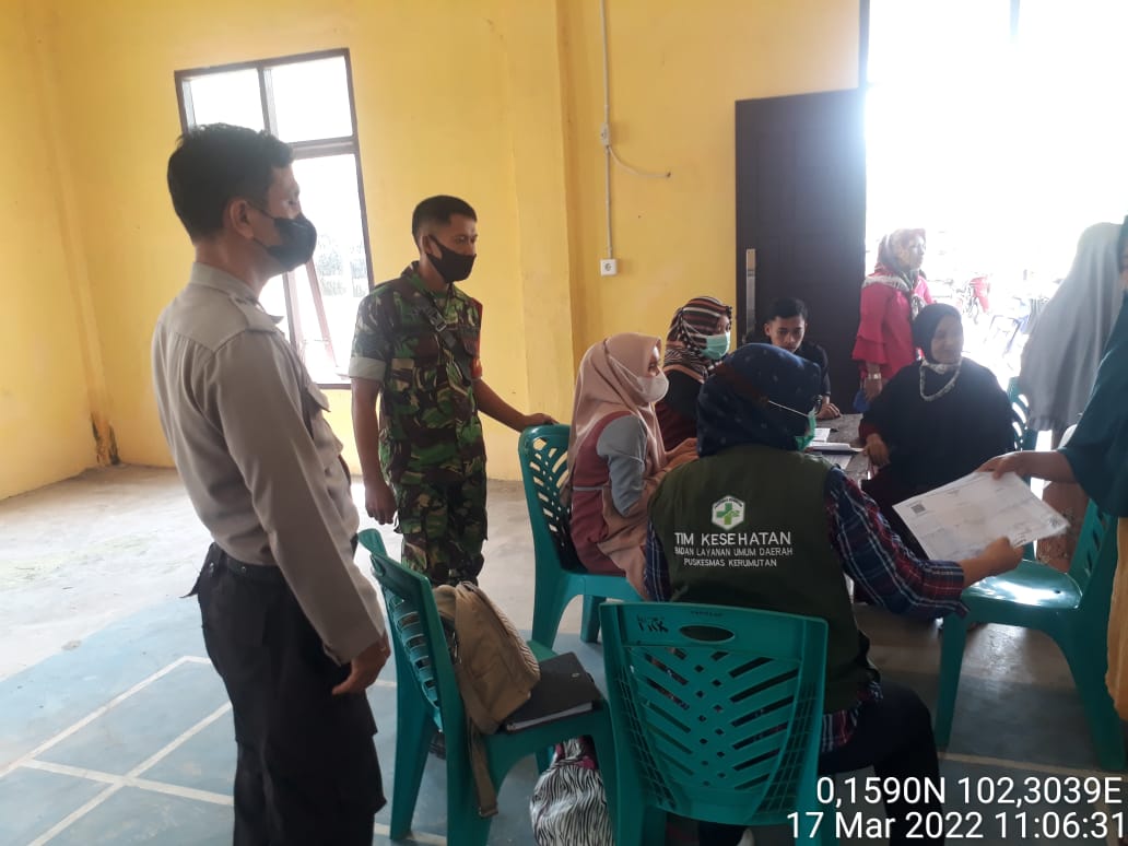 Pelalawan | khabarterkini.id – Bhabinkamtibmas Desa Pangkalan Panduk Polsek Kerumutan Bripka Mujiono SH, pelaksanaan vaksin tahap I,II dan Booster di Gor Balai Desa Pangkalan Panduk, Kamis, (17/04/2022).