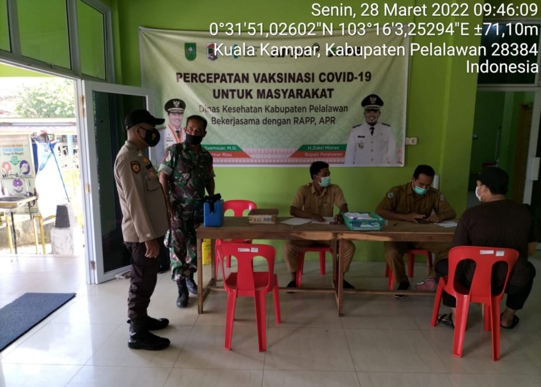 Pelalawan|khabarterkini.id – Pencegahan Penularan Covid-19, Polsek Kuala Kampar kembali turun melakukan pengawalan kegiatan vaksinasi di wilayah hukumnya, Senin (28/3/2022).