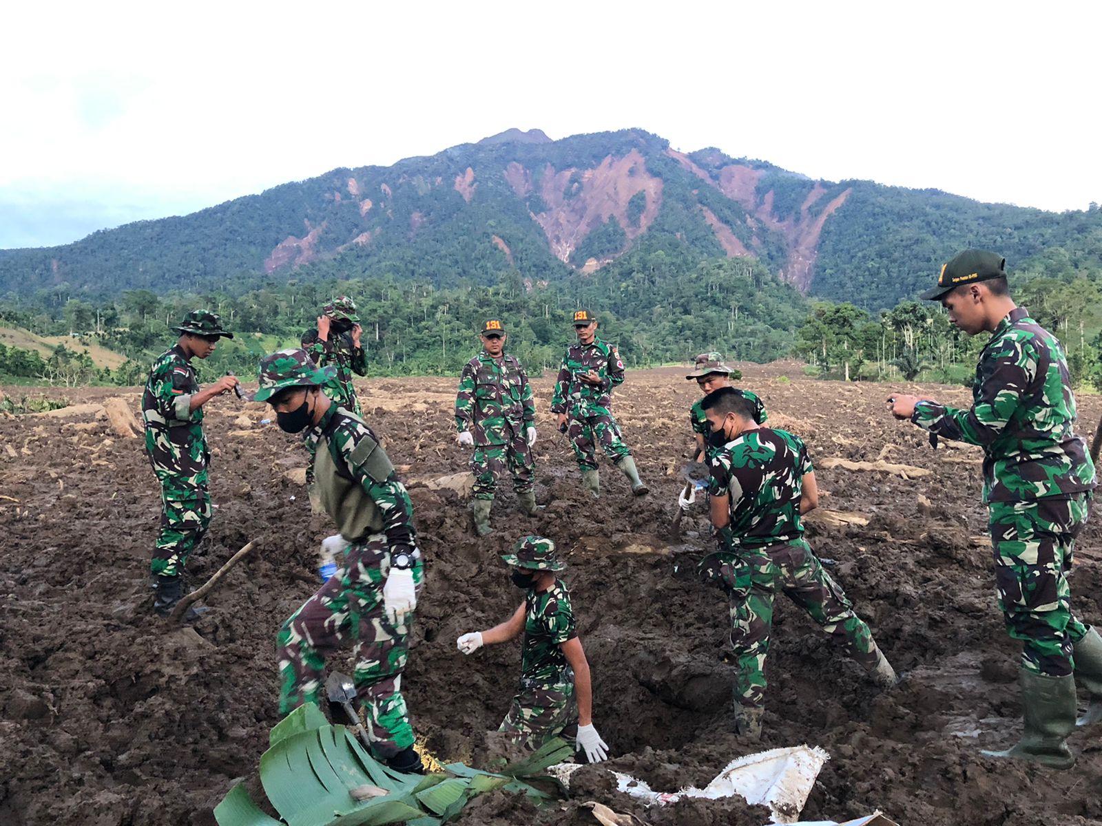 Kapten Inf Heri Wahyu mengatakan identifikasi korban memanfaatkan anjing masyarakat, Salah satu prajurit memanfaatkan penciuman anjing untuk mengindetivikasi korban hilang yang tertimbun lumpur material longsor