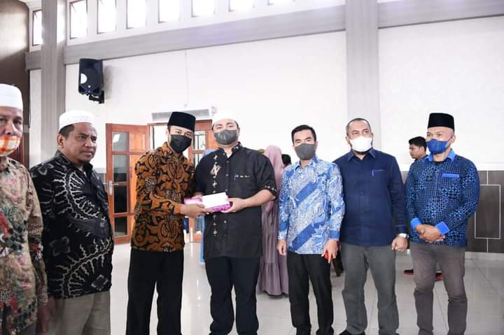 Labura | Khabarterkuni.id-Bupati Labuhanbatu Utara Hendriyanto Sitorus, SE, MM bersama Wakil Bupati Labuhanbatu Utara H. Samsul Tanjung, ST, MH, menyerahkan bantuan tali asih kepada 450 orang guru mengaji, bilal mayit, dan nazir masjid Kecamatan Kualuh Hulu, dan Kecamatan Kualuh Selatan yang dilaksanakan di Aula Ahmad Dewi Syukur, Komplek Kantor Bupati, Aek Kanopan, Sabtu (9/4).