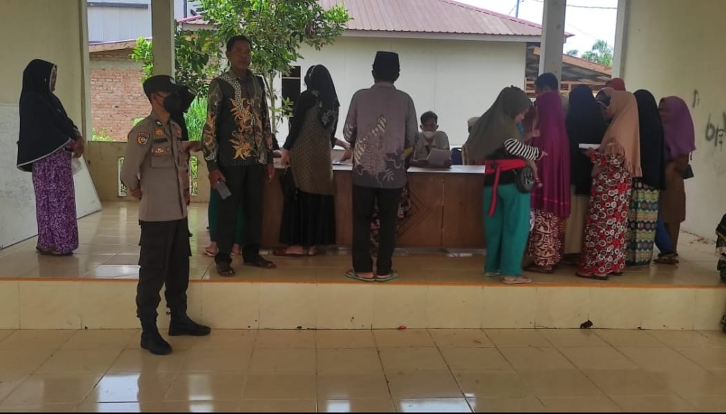 Petugas Kepolisian Polsek Teluk Meranti Jajaran Polres Pelalawan melakukan pengawalan penyaluran bantuan sosial di Kantor Desa Teluk Binjai, Sabtu (16/4/2022).