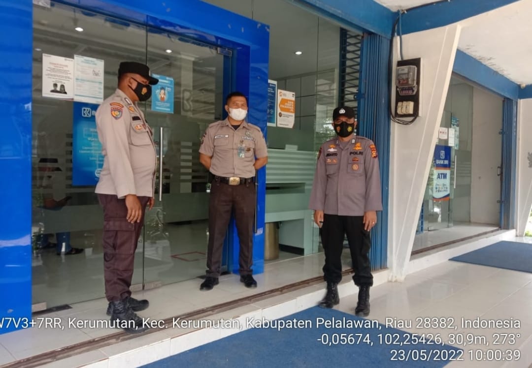 Pelalawan|khabarterkini.id- Kapolsek Kerumutan Iptu Putra Sontomi, S.kom melalui Kanit Binmas Bripka Rahmad Polsek Kerumutan, bersama piket fungsi melaksanakan kegiatan patroli kewilayahan di Bank BRI Unit Kerumutan, Senin, (23/05/2022).