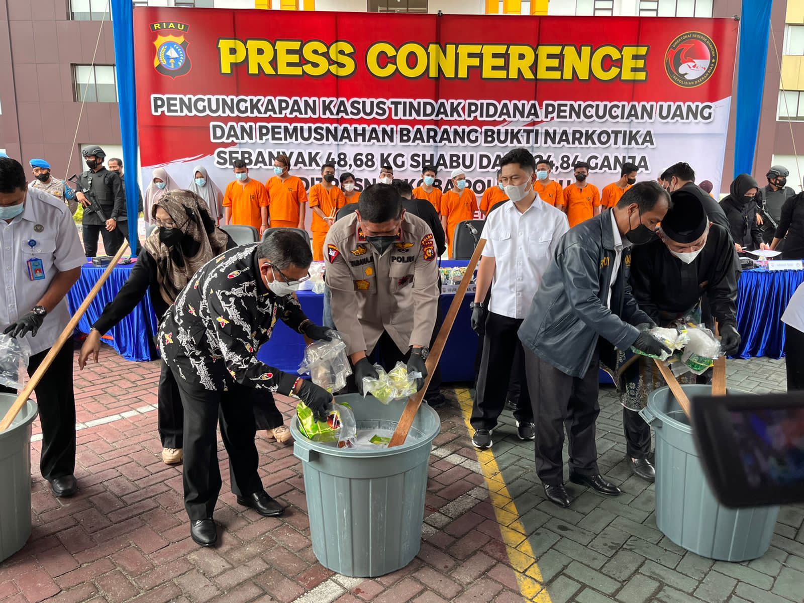 Kegiatan pemusnahan dipimpin oleh Wakapolda Riau Brigjen Pol Tabana Bangun didampingi Diresnarkoba Kombes Yos Guntur Yudi Fauris Susanto, Kabid Humas Kombes Sunarto dan dihadiri Wakil Gubernur Riau Brigjen TNI (Purn) Edy Natar Nasution, Kepala BNNP, serta perwakilan dari pihak Kejati Riau dan lainnya.