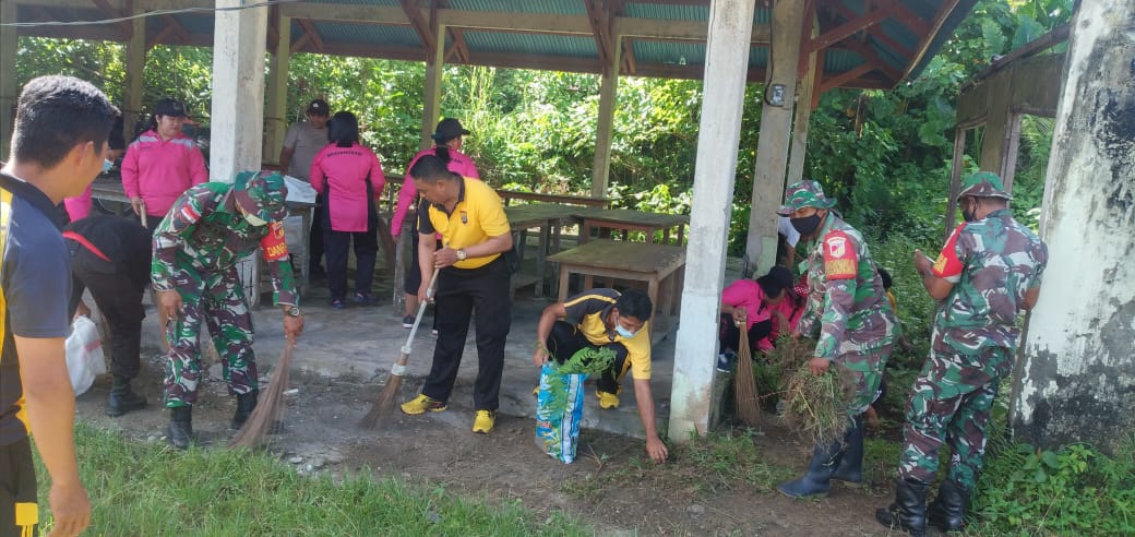 Talaud | Khabarterkini.id-Kegiatan olah raga bersama dan kerjabakti dengan UPTD Puskesmas Gemeh,Babinsa Koramil 05 Essang dan Bhayangkari Ranting Polsek Gemeh digelar dalam rangka memperingati HUT Bhayangkara ke-76 .
