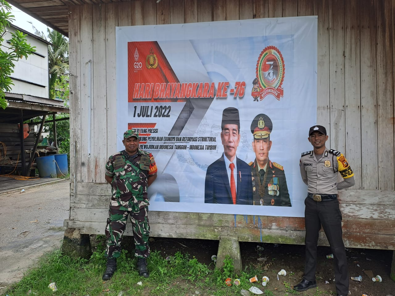 Pelalawan|khabarterkini.id-Pemasangan spanduk menjelang HUT Bhayangkara Ke 76, dilakukan oleh personil Polsek Telur Meranti di Wilayah Kecamatan Teluk Meranti Kabupaten Pelalawan, Sabtu (25/6/2022).