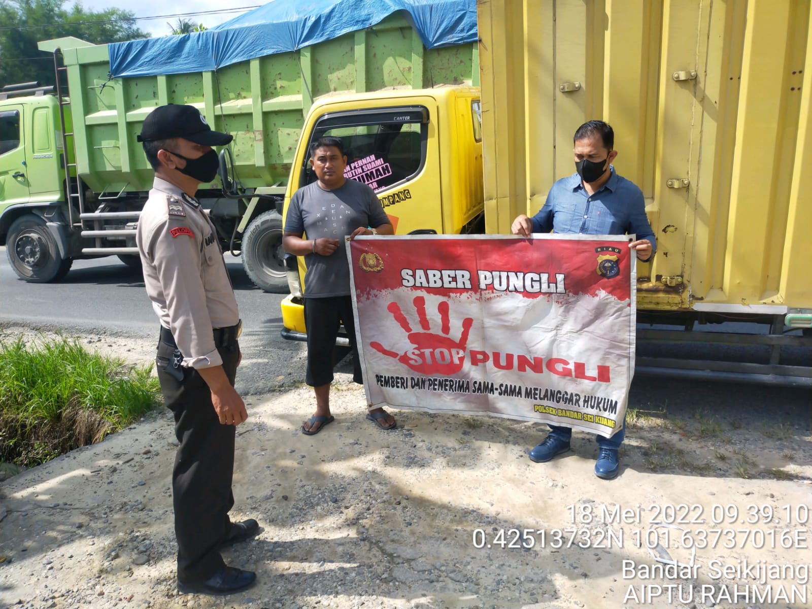 “Kami melakukan sosialisasi ini dengan cara berdialog dan membentangkan spanduk Saber Sungli dengan tetap menerapkan protokol kesehatan,” ujar AKP Mulian SH.