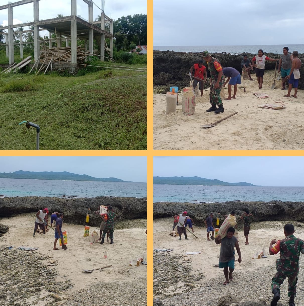 Talaud | Khabarterkini.ld-Talaud-Sebagai wujud kemanunggalan TNI dan rakyat, Babinsa Koramil 1312-02/Lirung Serka Olden Wuana bersama warga membantu pengambilan material pasir untuk pembangunan rumah tinggal salah satu warga binaanya di Desa Moronge selatan dua Kecamatan. Moronge,Kabupaten Kepulauan Talaud. Senin, 18/07/2022.