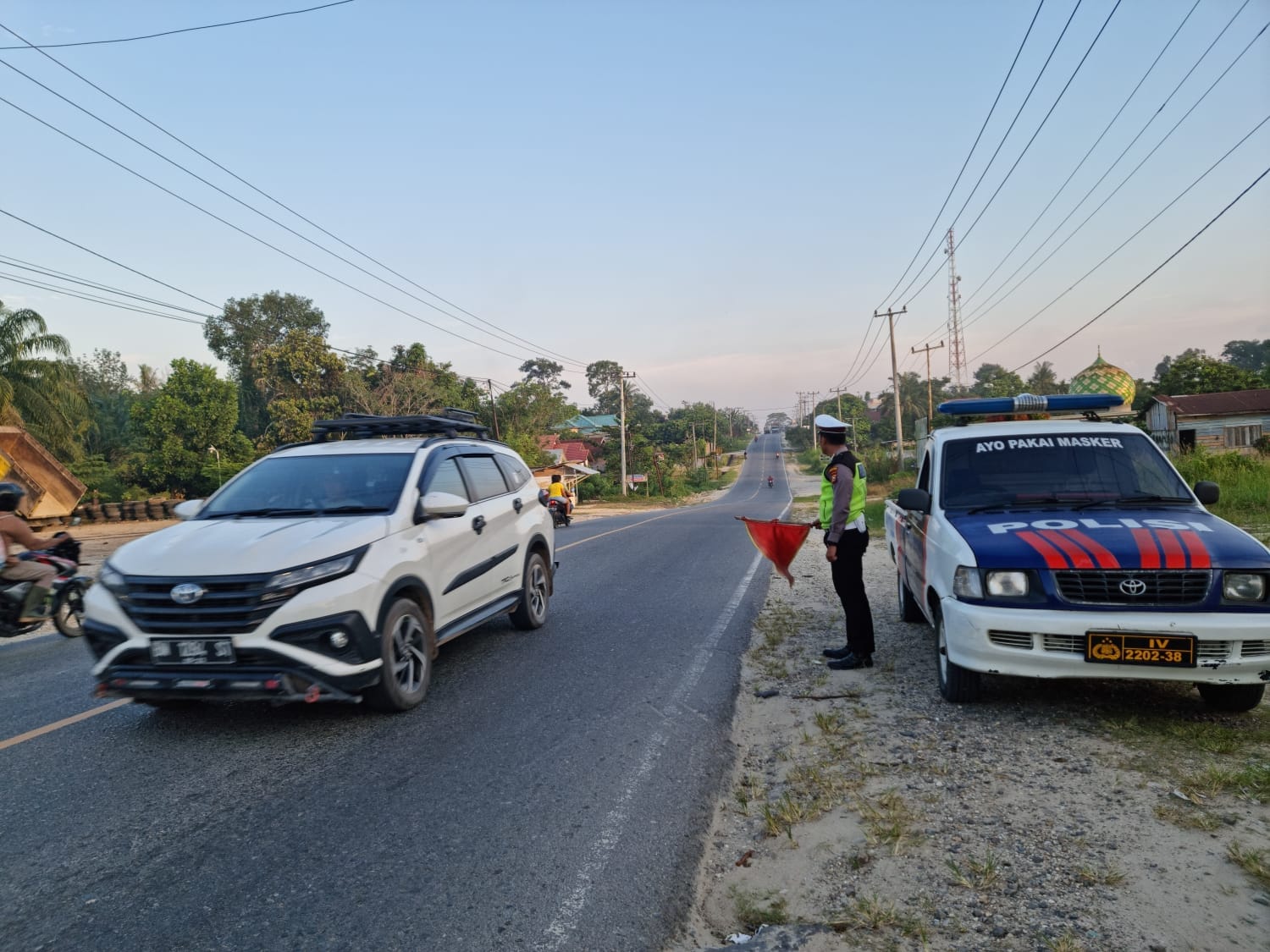 Pelaksana kegiatan kali ini, oleh Bripka Imam Refki dan Bripda Seto Lelono di sepanjang Jalan Lintas Timur, Kecamatan Pangkalan Kuras, Kabupaten Pelalawan.