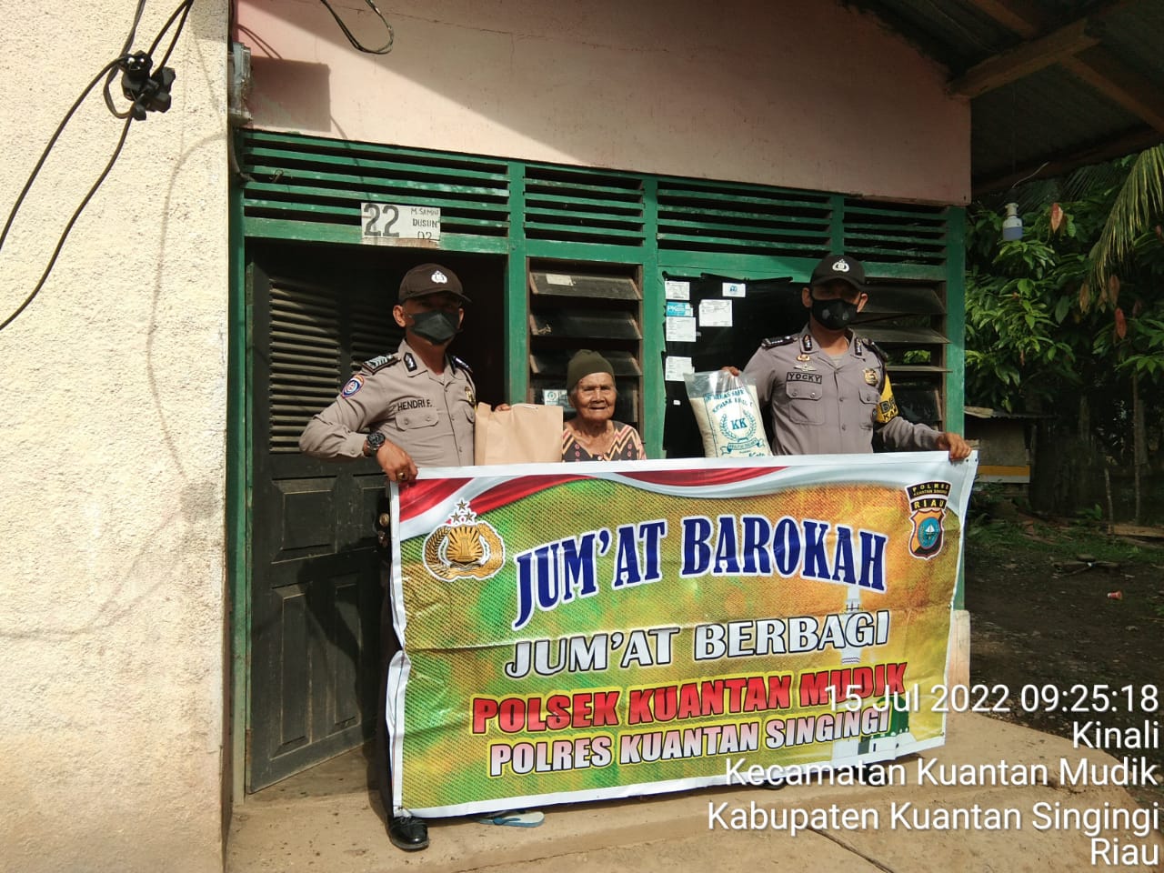Kegiatan Jum’at Barokah, bantuan diserahkan langsung Kapolsek bersama personilnya Kapolsek Kuantan Mudik, AIPDA Yuris Manar Kanit Binmas, BRIPKA Hendri Fitra dan BRIPKA Yocki Sumbari Bhabinkamtibmas Polsek Kuantan Mudik.