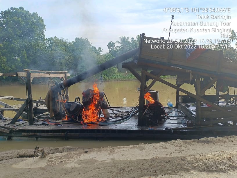 Penertiban Penambang Emas Tanpa Izin (PETI) di aliran sungai Batang Kuantan area pancang finish pacu jalur desa Bukit Pedusunan Kecamatan Kuantan Mudik Kabupaten Kuantan Singingi oleh Kasat Reskrim AKP Linter Sihaloho, SH.MH, Kapolsek Kuantan Mudik IPTU Ferry M. Fadillah, SH, Kasubsektor Gunung Toar IPTU Mara Enda bersama dengan gabungan Tim Opsnal Sat Reskrim Polres Kuansing dan Personil Polsek Kuantan Mudik, Kamis (20/10/2022) sekira pukul 15.00 WIB.