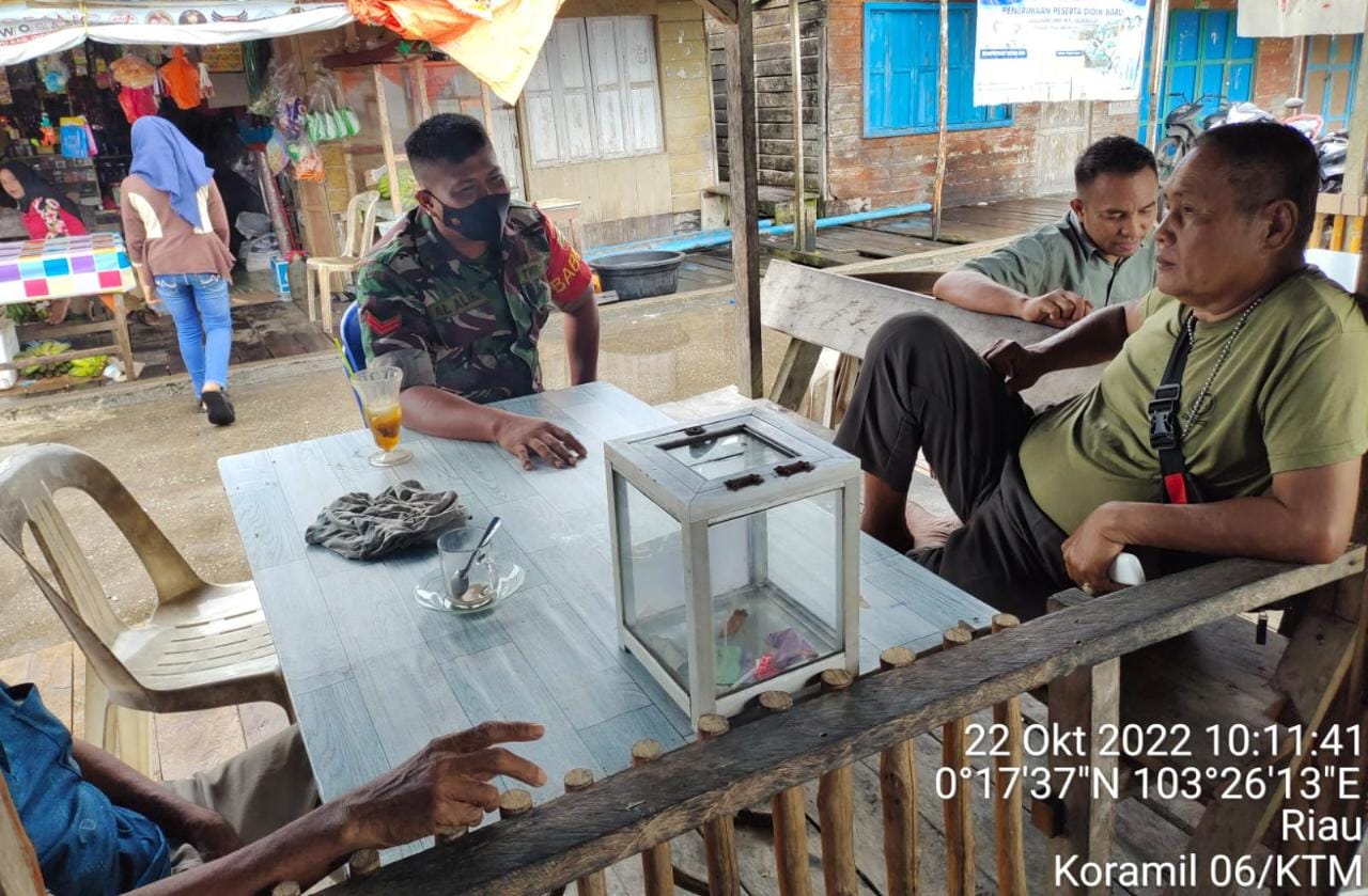 Koptu Al Alim Bintara Pembina Desa (Babinsa) Koramil 06/Kateman, jajaran Kodim 0314/Inhil melaksanakan Komunikasi Sosial (Komsos) dengan warga binaan di RT 05 RW 01 Dusun 1 Desa Hibrida Mulya Jaya, Kecamatan Teluk Belengkong, kabupaten Indragiri Hilir, pada Sabtu (22/10/2022) pagi.