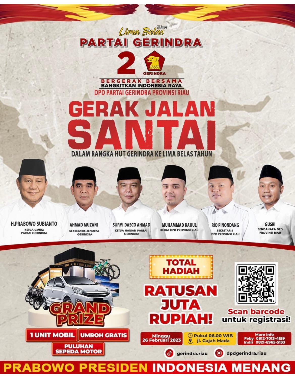 “Kita adakan kegiatan jalan sehat pada sabtu 25 Februari 2023 kata Sek DPC Gerindra Kabupaten Indragiri Hulu Marlius SPd