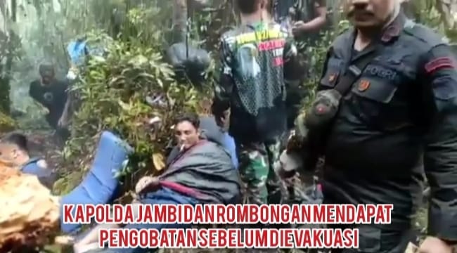 Tampak sejumlah anggota polisi dan anggota Kodim Kerinci tengah membantu memberikan perawatan medis kepada salah satu korban jatuhnya helikopter.