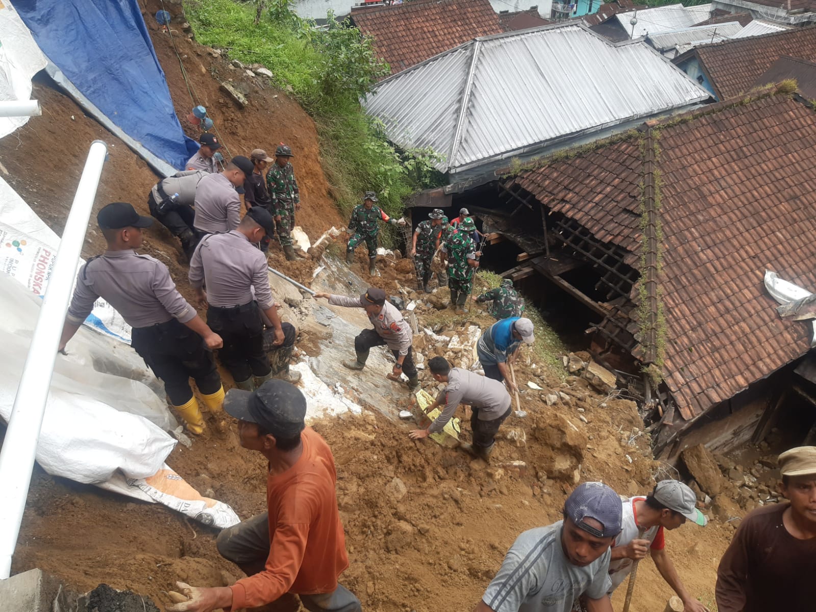 TNI-Polri, dan Warga Bersinergi Bersihkan Material Tanah Longsor