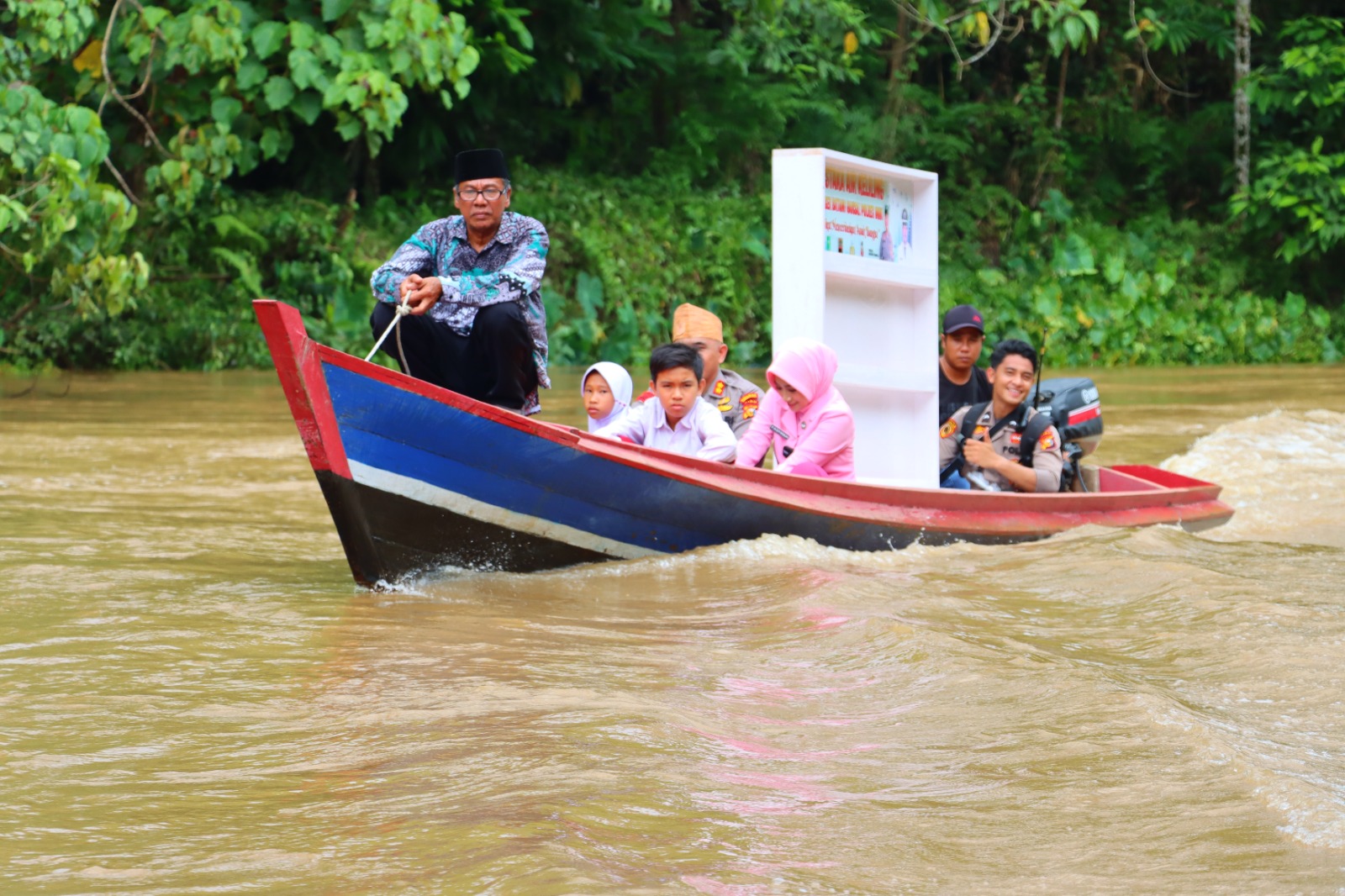 Setelah meresmikan pustaka air, Kapolres mengajak anak-anak setempat untuk menyisiri sungai Batang Gansal menggunakan sampan motor atau boat yang dijadikan pustaka air agar anak-anak bisa merasakan manfaat pustaka air keliling tersebut.