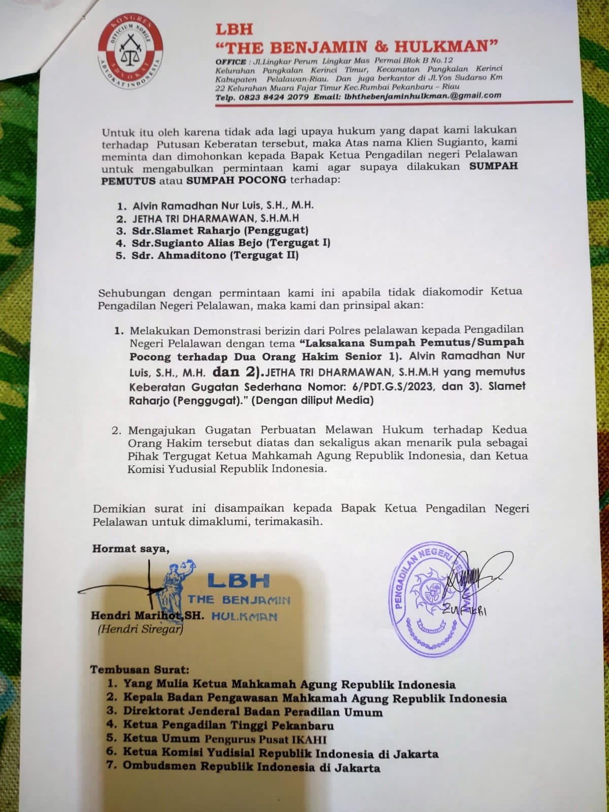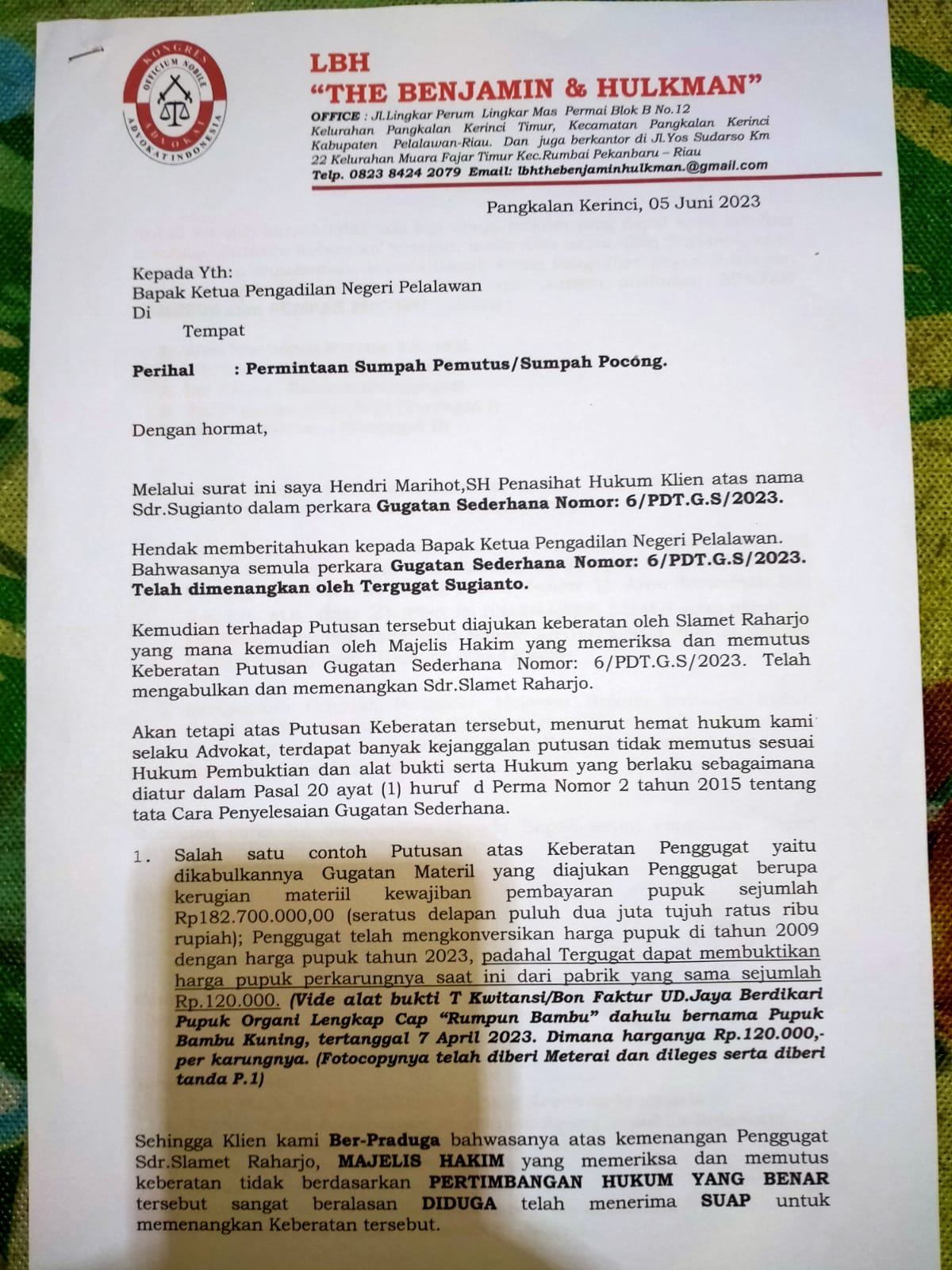 Hari ini, Senin 5 Juni 2023 melalui suratnya kepada Ketua Pengadilan Negeri Pelalawan, mengajukan tantangan sumpah pocong/sumpah pemutus terhadap dua orang hakim Pengadilan Negeri Pelalawan yang telah memberikan putusan Keberatan dalam perkara nomor:6/PDT.G.S/2023.