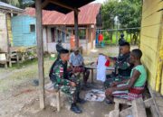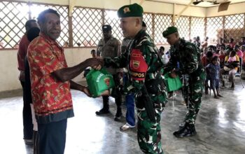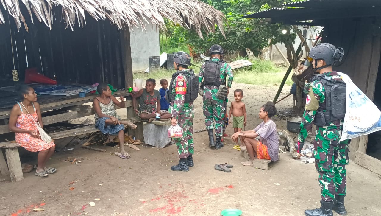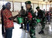 Satgas Yonif 132/BS Pos Sawiyatami berbagi kebahagiaan jelang Hari Raya Idul Adha 1444H dengan membagikan sembako kepada masyarakat Kp. Sawiyatami, Distrik Mannem, Kab. Keerom, Provinsi Papua, Selasa (27/06/2023).