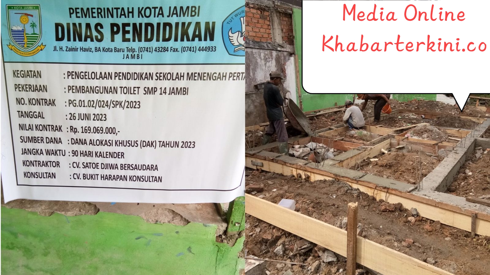 “Pelaksanaan proyek pembangunan Wc dan rehabilitasi gedung mushola anggaran Dana Alokasi Khusus (DAK ) Pagu sebesar Rp 212 Juta tahun 2023 ,Di SMPN.14 Kota Jambi, pekerja tidak dilengkapi pelengkapan pengaman kerja ( K3 ).