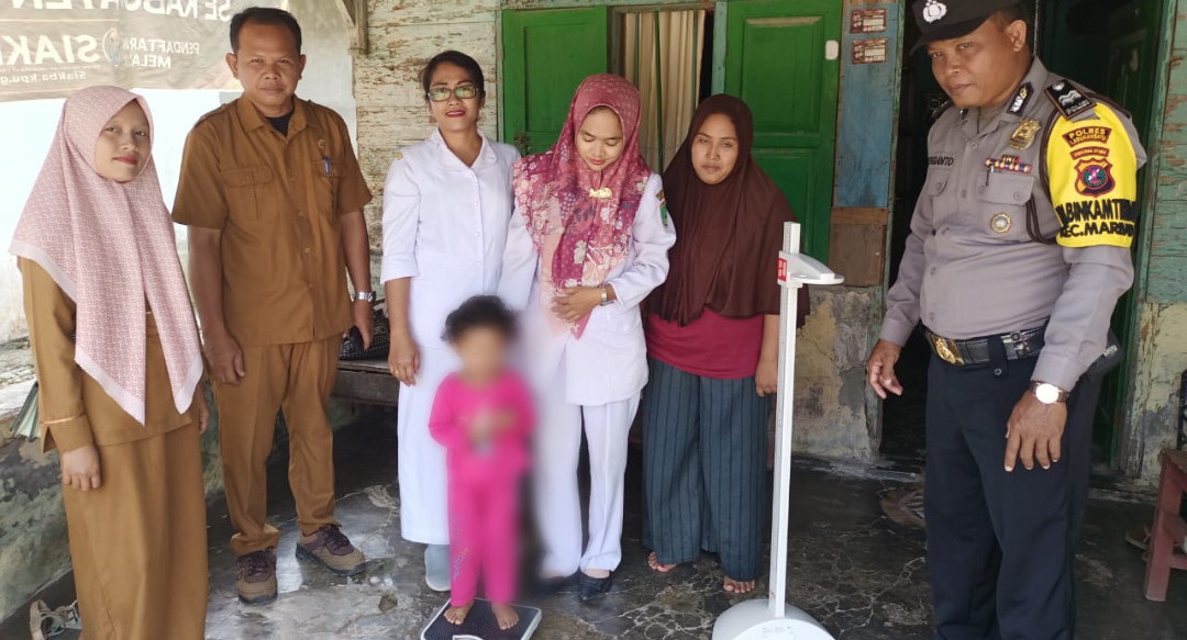 Kunjungan Bhabinkamtibmas Aiptu Sugianto didampingi oleh Kepala Desa Tubiran Herianto dan tim terpadu stunting yaitu bidan Desa Meilina Sinaga dan ahli gizi Dwi Riyanti.