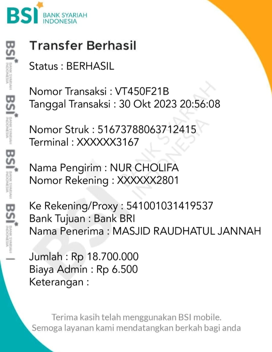 Oleh Dien Puga langsung mengirimkan foto Masjid tersebut kepada yang mengaku Catur Sugeng Susanto itu. Tak menunggu lama, Catur Sugeng Susanto langsung mentransfer dana sebesar Rp 18.700.000 ke Rekening Masjid Raudhatul Jannah tersebut dengan bukti Transfer berupa resi pengiriman.