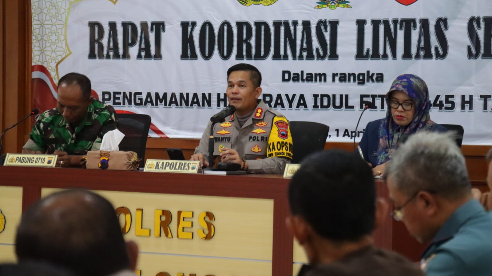Rapat ini dipimpin langsung oleh Kapolres Pekalongan AKBP Wahyu Rohadi, S.I.K., M.H., dan dihadiri oleh Asisten 2 Sekda Kabupaten Pekalongan, Dra. Siti Masruroh, M.Si., Pabung Kodim 0710/Pekalongan Mayor Kav. M. Purbo S., kepala BPBD Kabupaten Pekalongan, Budi Rahardjo, kepala Dishub Kabupaten Pekalongan, Agus Purwanto, kepala Kemenag Kabupaten Pekalongan, H. Imam Tobroni, Kejaksaan Kabupaten Pekalongan, diwakili Tony Aji dan Danposal Wonokerto Kapten Laut (P) Arif Mardiyanto.