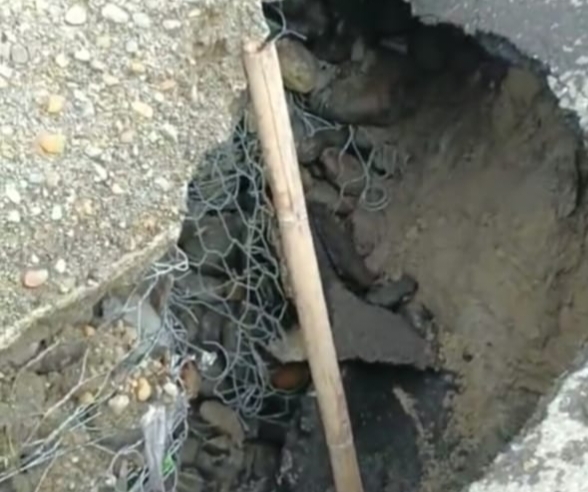 Sehingga terjadinya erosi tanah dibawah jalan aspal tersebut. Dan akhirnya jalan tersebut ambelas, kedalaman ambelasnya sekitar 2 meter, panjangnya sekitar 2 meter, serta lebarnya sekitar 1 meter.