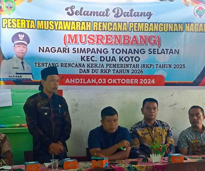 Musyawarah Perencanaan Pembangunan (Musrenbang) untuk Rencana Kerja Pemerintah (RKP) 2025 dan Dokumen Usulan RKP 2026 berlangsung sukses di Nagari Simpang Tonang Selatan, Kecamatan Dua Koto, Kabupaten Pasaman. Kegiatan ini diselenggarakan pada hari Kamis, 3 Oktober 2024.