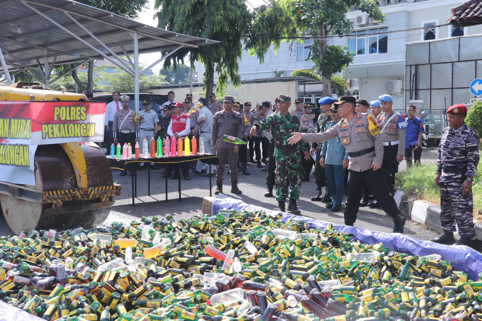 Ribuan botol miras berbagai jenis dimusnahkan Polres Pekalongan usai pelaksanaan Apel Gelar Pasukan Ops Lilin Candi 2024 di Mapolres, Jumat (20/12/24). Kegiatan ini dipimpin langsung oleh Kapolres Pekalongan AKBP Doni Prakoso Widamanto, S.I.K yang dihadiri oleh Forkopimda Kabupaten Pekalongan serta stakeholder terkait lainnya.