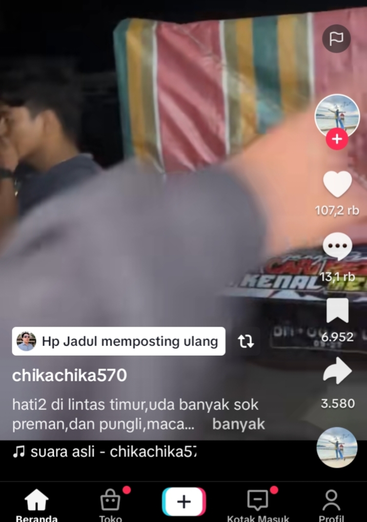 Tidak berselang lama setelah kejadian, ternyata vidio tersebut diposting di media sosial TikTok oleh akun @chikachika570, dan dalam waktu singkat vidio itu pun viral. Namun yang di sayangkan adalah caption atau judul vidio yang bertuliskan,’hati2 di lintas timur,uda banyak sok preman,dan pungli,macam jagoan aja,’.