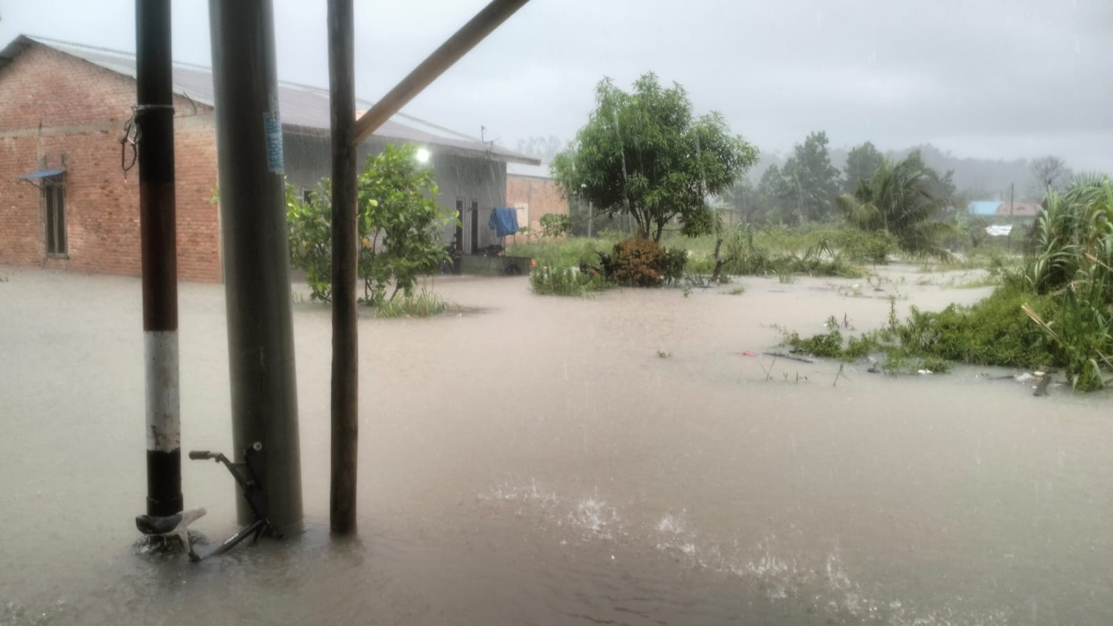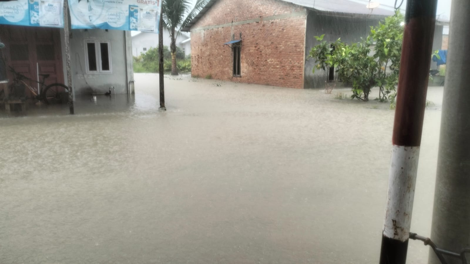 Banjir yang melanda sejak dini hari ini membuat banyak rumah terendam air hingga mencapai ketinggian setinggi mata kaki di dalam rumah dan sekitar 50-60 cm di halaman depan rumah warga.