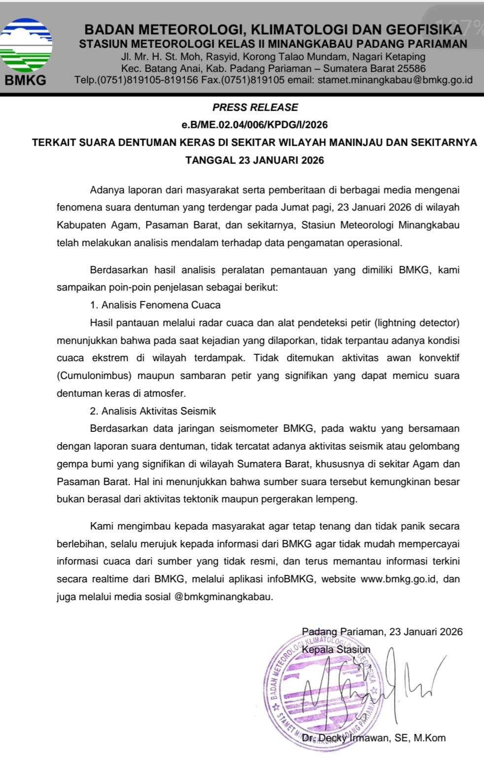 Kepala Stasiun Meteorologi Minangkabau, Dr. Decky Irmawan, menyatakan bahwa BMKG telah melakukan analisis menyeluruh menggunakan seluruh data pengamatan operasional yang tersedia.